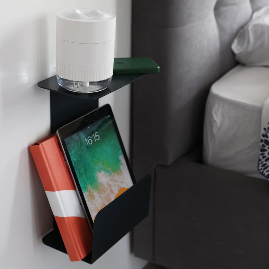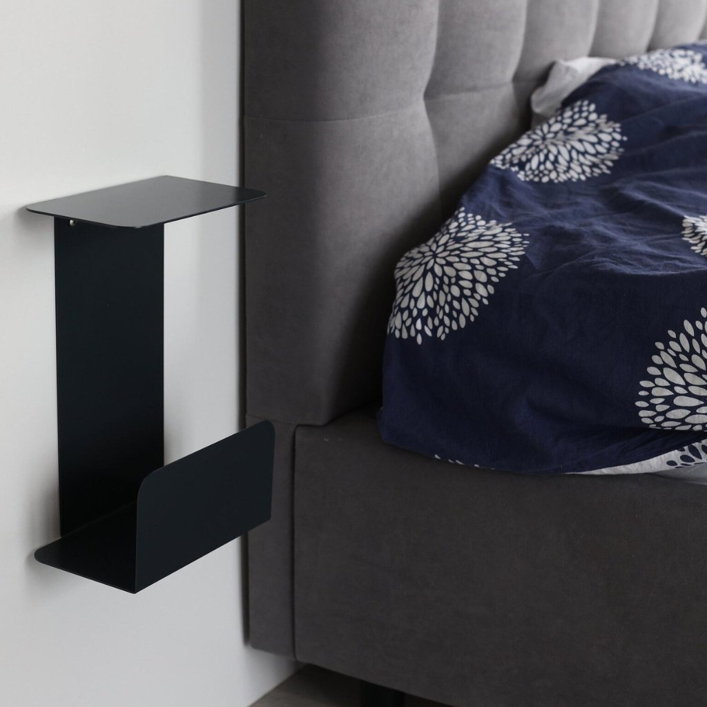 ALT odlehčuje prostor a vytváří pocit klidu. Nástěnná konstrukce ponechává podlahu volnou, usnadňuje úklid a vizuálně zpřehledňuje místnost. Pevné kovové provedení poskytuje stabilní místo pro lampičku, knihu, telefon nebo další nezbytnosti, které chcete mít večer i ráno po ruce. ALT je řešení pro ty, kteří hledají funkci v čisté podobě.